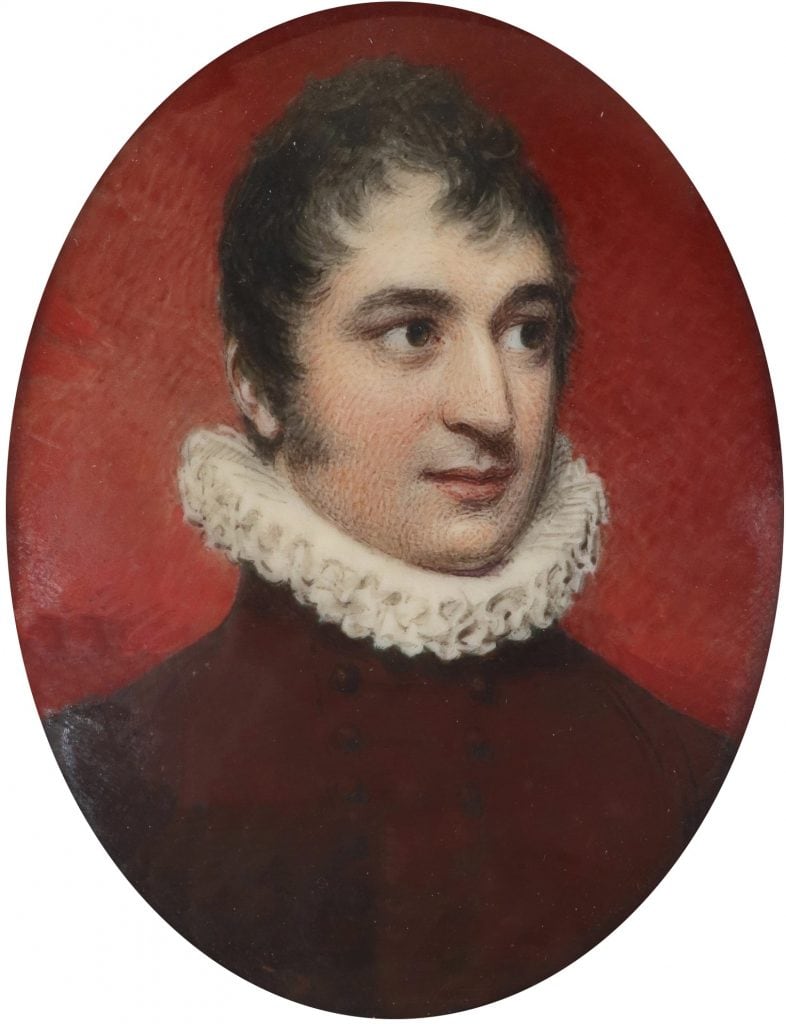 With its elaborate outfit and dark red background, this miniature is rather a surprise within William Wood’s catalogue. His work is often characterised by understatement. Subjects are commonly set before a subdued sky of whites and greys with touches of blue. His men tend to wear dark jackets of either navy or brown, and his women white, high-waisted, empire line dresses. There are gentlemen in military uniform, certainly, but rarely an outfit so overtly theatrical as this. Taking the clothes and the deep red curtain together, my first thought was that the subject must be an actor dressed for his best-known Shakespearean role, but the truth is more prosaic.